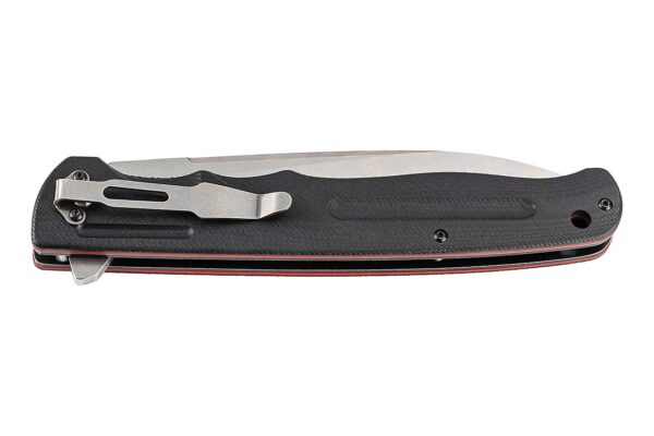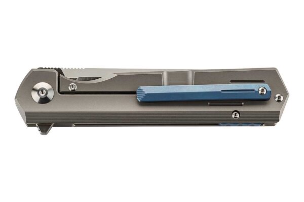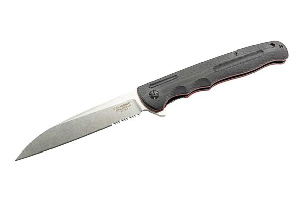Das Einhandmesser aus der CJH Serie von Herbertz ist mit einer schwarz beschichteten Klinge aus rostfreiem AISI 420 Stahl ausgestattet und verfügt über eine praktische Teilsägezahnung. Beidseitige Daumenpins oder einem Flipper ermöglichen das Öffnen der Klinge mit nur einer Hand. Durch einen Liner Lock Mechanismus wird die Klinge zuverlässig arretiert. Der ergonomisch geformte Griff liegt dank ausgeprägter Fingermulden sicher in der Hand. Die Heftschalen aus schwarzem ABS Kunststoff sind auf der Frontseite mit einer interessanten Metalliclackierung versehen. Eine Fangriemenöse und ein schwarzer Tip Down Taschenclip vervollständigen die Ausstattung.
